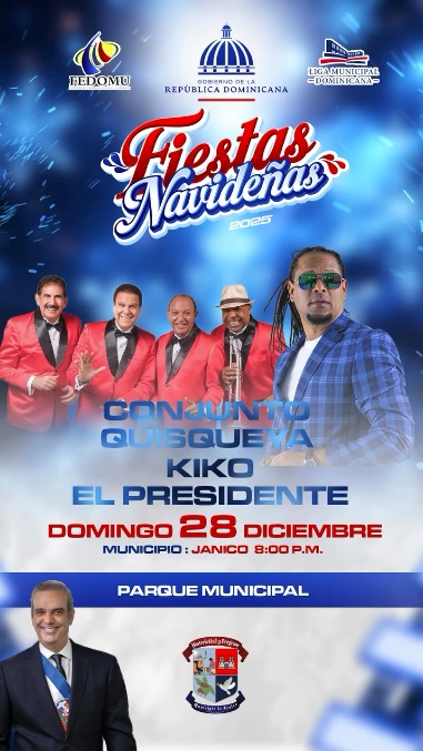 Te invitamos a disfrutar de una Fiesta Navideña Gratis para el pueblo con Kiko el presidente y el Conjunto Quisqueya, en el Parque Municipal de Jánico. El próximo domingo 28 de diciembre a partir de las 8:00 PM, esta actividad esta programada para toda la familia.