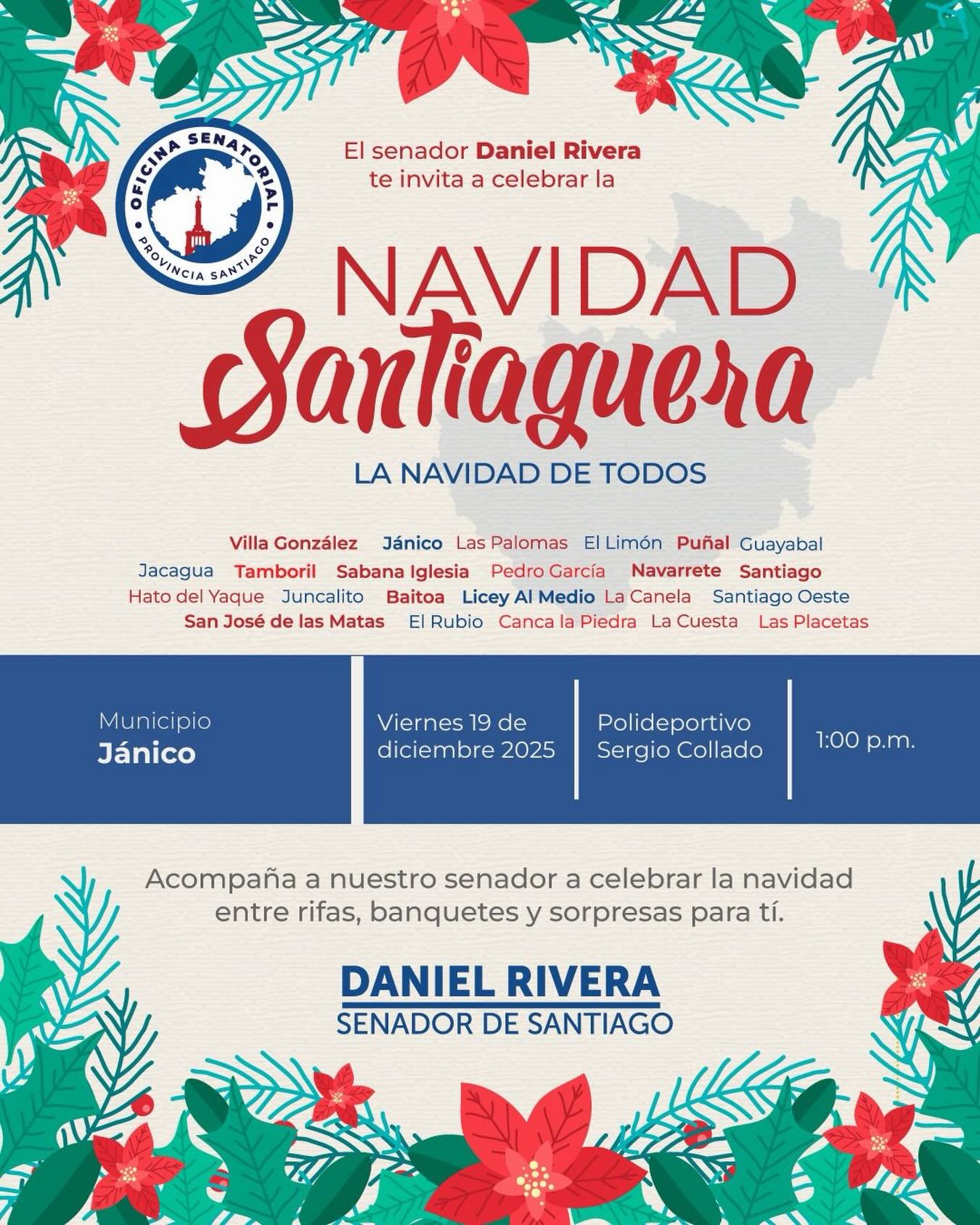 La Alcaldía Municipal , junto al Senador Daniel Rivera, te invita a celebrar la Navidad en un espacio lleno de muchas sorpresas para todo el Municipio.